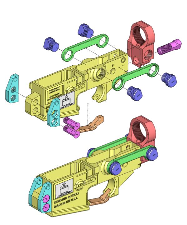 To design a rifle kit for the AR-15 platform of rifles, that once outfitted, will enable a user to take this weapon into combat, and out of combat, in optimal condition. To design a rifle to last a minimum of 300 cartridges discharged, and an ideal maximum of 1000 cartridges or more discharged. To design a lower receiver to be compatible with the most commonly available upper receivers with forward assists. To design the entire kit without the use of brims, supports, or any kind of external use of additive manufacturing. To design the entire kit to use PLA/PLA+, the most common and inexpensive filament to use other than ABS.